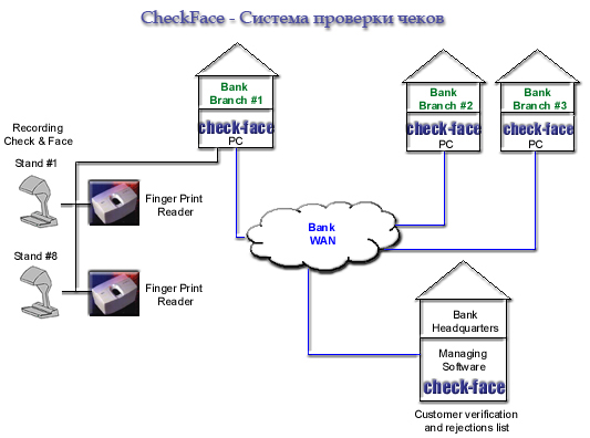 Единицы Check-Face соединены с центральным офисом банка, где и сохраняются данные, посредством банковской WAN. Прежде, чем чек подтвержден, ПО Check-Face проверяет списки подтверждений и отказов и решает, принять ли чек.