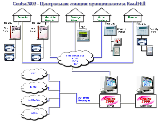 Центральный сервер получает данные со всех точек, используя различные системы для передачи данных. По получению данных Centra сервер представляет текущее событие оператору системы. Особые указания появляются на экране: точное место, где произошло событие, будет указано на графических картах.