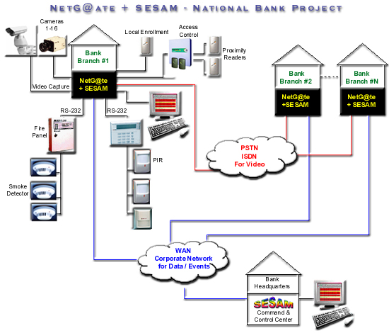 Each branch has up to 16 cameras (fixed and PTZ cameras) connected to the SESAM+