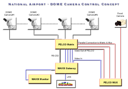 to a PELCO video matrix. The video is transferred to both a MAVIX gateway and a PELCO MUX (multiplexer) unit and from there to