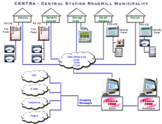 monitoring a multiple site installation. Schools, Geriatric hospitals, sewage